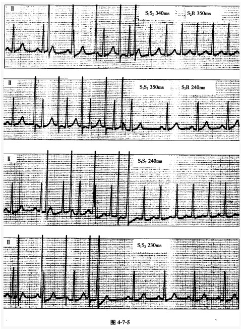心动过速诱发窗口的测定一般采用期前刺激法,即采用步长10ms进行反扫描和正扫描,并诱发心动过速,图4-7-5显示的心动过速的诱发窗口为