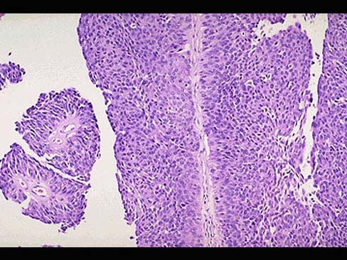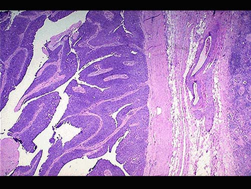 男,65岁。间歇性无痛性肉眼血尿1年。膀胱镜检:膀胱内距输尿管口0.5cm,可见2.5cm×1cm×1cm乳头状肿块,无蒂。静脉肾盂造影可见左肾轻度积水,输尿管全段轻度扩张。行膀胱部分切除后镜检如图所示,下列说法正确的是 ( )