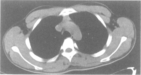 女,43岁,两眼不能完全睁开,全身无力2年余。胸部CT扫描前纵隔内发现肿块,如图,最可能的诊断是