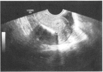 患者,女性,40岁,妇科超声检查:中下腹纵切面如图,强回声所示为